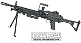 The M249 SAW paintball gun is a lightweight gas-operated 200 round magazine-tube-fed individually portable paintball-machine-gun capable of delivering a large volume of effective fire. The M249 provides accurate fire on par with the accuracy of a regular marker yet gives the heavy volume of fire common to a machine gun. The M249 replaces two automatic M16A1 rifles in the rifle squad on a two-for-one basis in all infantry type units and in other units requiring high firepower. The M249 SAW paintball gun fires standard .68 caliber paintballs using a standard 200 round loader with realistic selective firing modes: semi 3 round burst and full auto at 420 rounds per minute. The unit features all metal construction and weighs 15lbs. The M249 SAW operates with both CO2 and compressed air using a remote line. The M249 SAW series paintball gun provides a valuable realistic training tool for military combat training and gives operators a true-to-life feel…as if they are training with their duty gear. RAP4 T68 M249 SAW Paintball Gun: – .68 caliber system – Compatible with marking rounds rubber rounds clear rounds and less lethal rounds – Selective firing mode (semi/burst/auto) – 200 round loader – All metal construction – Works with CO2 / Compressed Air / HPA / Nitrogen – Maximum range: 300 feet – Effective range: 150 feet – Velocity 300-350 fps (adjustable) – Weight 15lbs – One year warranty