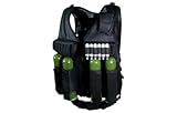 Official UAG Tactical Paintball Airsoft Armor Pod Vest- Stealth Black Color . Versatile one size fits most, fully adjustable in height and girth to fit from a small to X-Large adult. Constructed with Heavy duty premium Synthetic Material- crafted to take a beating while maintaining its excellent quality, featuring Law Enforcement combat quality Velcro, snap-on/Buckle Systems, and Zipper.Loaded with pockets & pouches: 8 Pod Pouches for Intensive Battle Operations,Fully Adjustable Elastic Air Tank Pouch,2 Utility and Grenade Pouches,Padded Radio Holder/Utility Pouch,10 Elastic Cartridge Holders for Close Quarter Battle Operations,Survival Cleaning Rod Elastic Holder,Law Enforcement Belt System,3 Large Mesh Pockets for Documents and Hydration Pouch for Hydration Bladder (Hydration Bladder Not Included).Includes a behind the neck rescue pull handle for extraction of a team member, a reinforced and texturized shooter/sniper non-slip shoulder pad, and 2 d-rings attached to the shoulders for hanging the vest when it’s not being worn. Complete ventilation mesh system for enhanced comfort and heat release during battles.