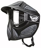 Affordable and featuring a space-age military style, JTUSA’s Elite nVader lean, mean paintball mask will keep you protected when the action heats up. This black mask features rounded, contoured areas of gray vent covering that accentuate the mask’s facial structure. It has an open top, premium foam interior, adjustable nylon stretch lens strap, and an adjustable chin strap that clicks to lock. The nVader also offers a 180-degree angle of vision, visor, and hard face protection. It comes with a Thermal lens, which offers high-performance fog-resistant protection and is recommended for extreme weather conditions where heavy fogging can be a factor. Additional lenses with tinting are also available.