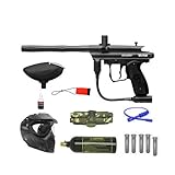 The Spyder Sonix paintball marker is now 15% lighter and 10% shorter, sporting a brand new look and feel. The Sonix comes standard with a threaded clamping feed neck, and Spyder has developed a tool-free striker plug to alleviate the need for tools while performing basic maintenance on the marker. This set comes complete with Sonix paintball marker, V-type goggle mask, 12-ounce CO2 tank, hopper, and spare parts kit.